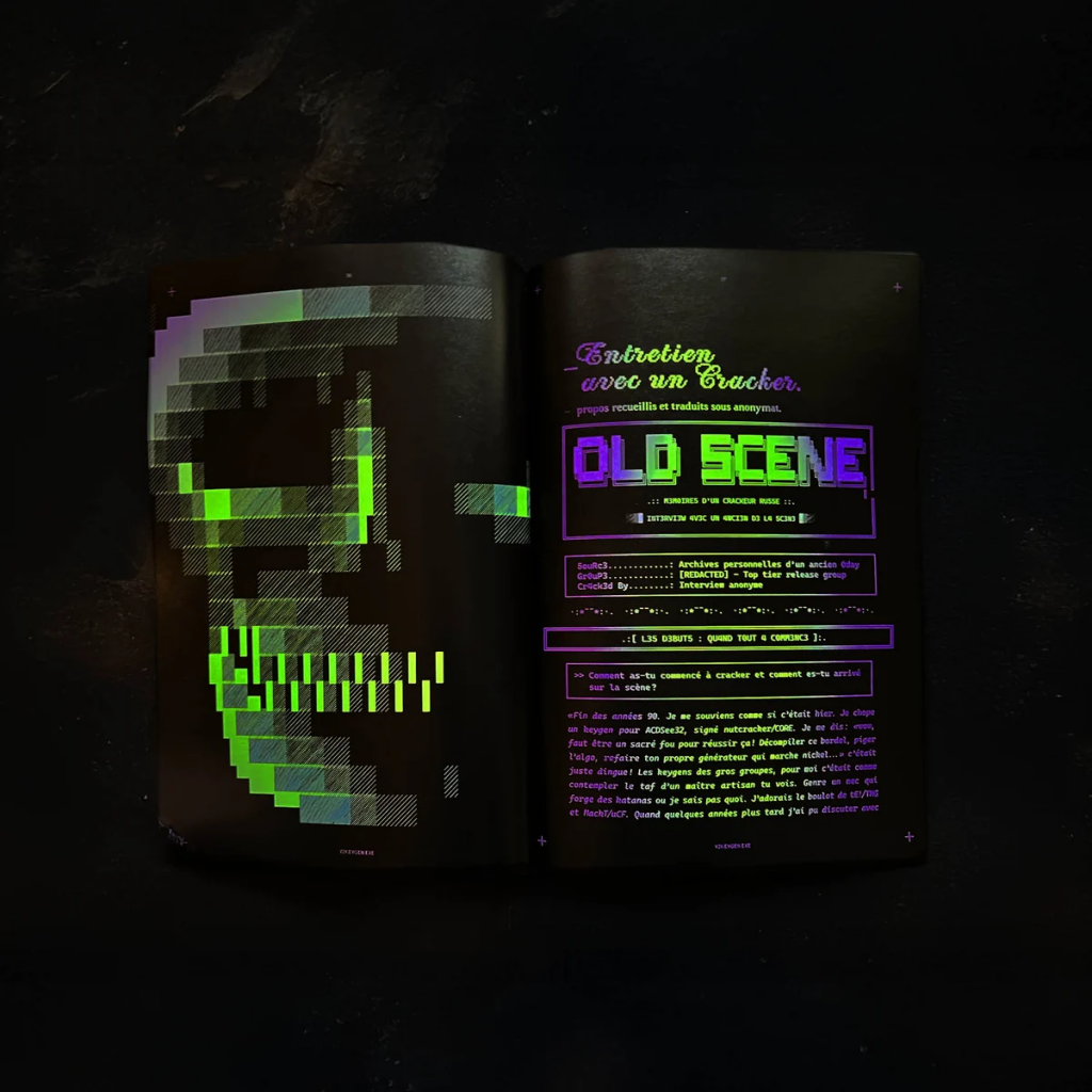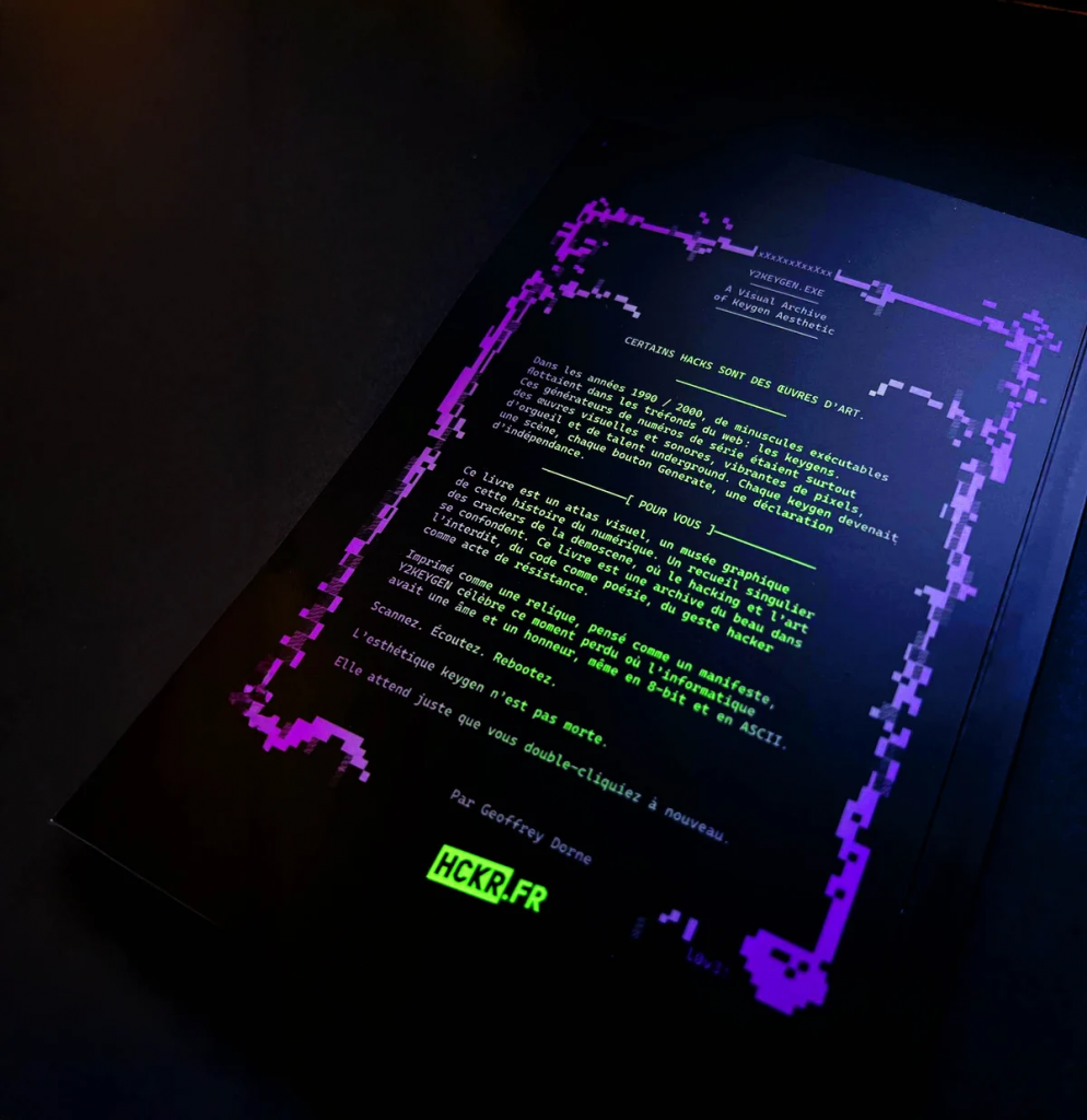 Je vous partage un projet un peu particulier : Y2KEYGEN, un livre que je viens de publier aux éditions HCKR. L’idée m’est venue en repensant aux années 2000, quand je téléchargeais des logiciels crackés… et que je découvrais ces petits programmes étranges : les keygens. Ces générateurs de clés de licence n’étaient pas juste des outils de piratage. C’étaient de véritables créations graphiques et sonores, avec leurs musiques chiptune, leurs animations en ASCII, leur esthétique pixel complètement assumée.